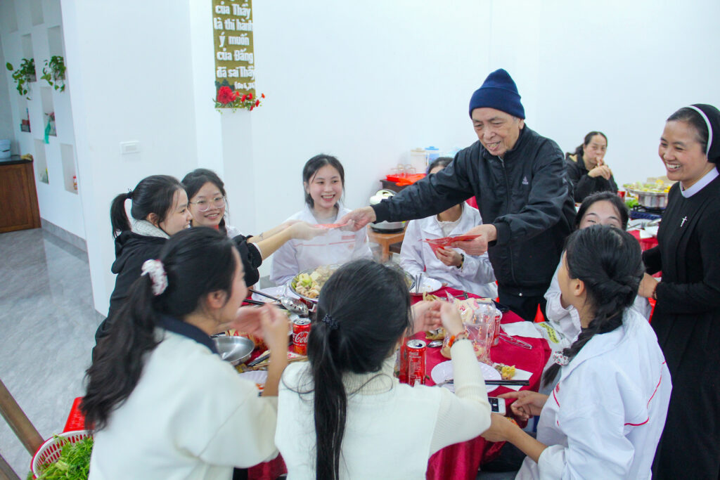 Niềm vui của ngày gặp mặt càng trở nên trọn vẹn và ấm áp hơn qua bữa tiệc Tất niên thân mật. Sự hiện diện hiệp thông, những lời chúc lành và những phong bao lì xì đỏ của Đức ông Giêrônimô trong bữa tiệc không chỉ là lộc đầu xuân, mà còn là nguồn động viên tinh thần vô giá, giúp các mầm non ơn gọi cảm nhận được tình gia đình thật gần gũi và yêu thương.