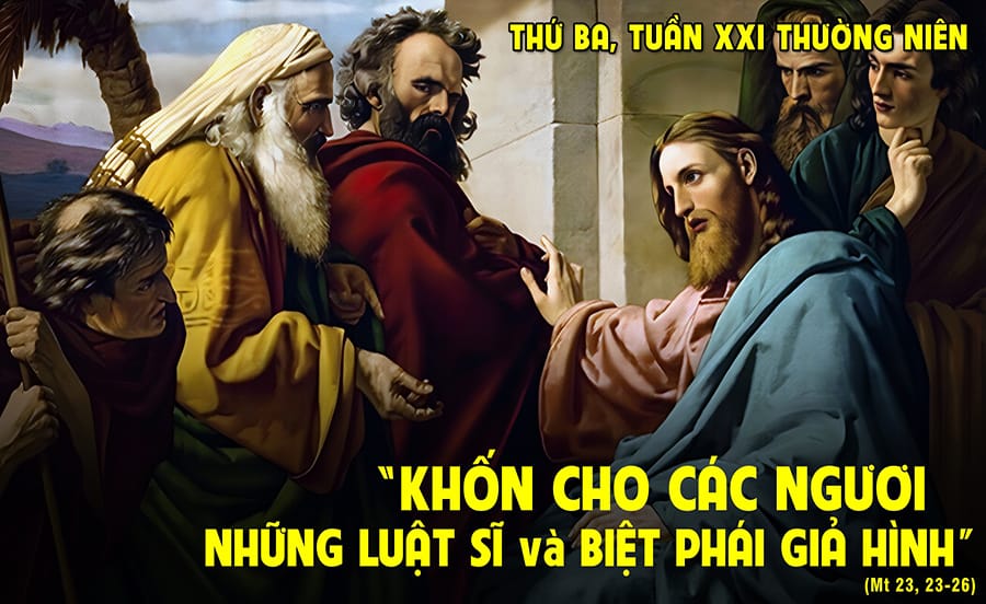 Chúa Giêsu trách mắng các nhà lãnh đạo Do Thái: “Khốn cho các ngươi…” Các Kinh sư và người Pharisêu tranh luận về những lời và luật lệ, nhưng không thể hiện sự yêu thương và không làm việc vì công lý. (Mt 23:13-22)
