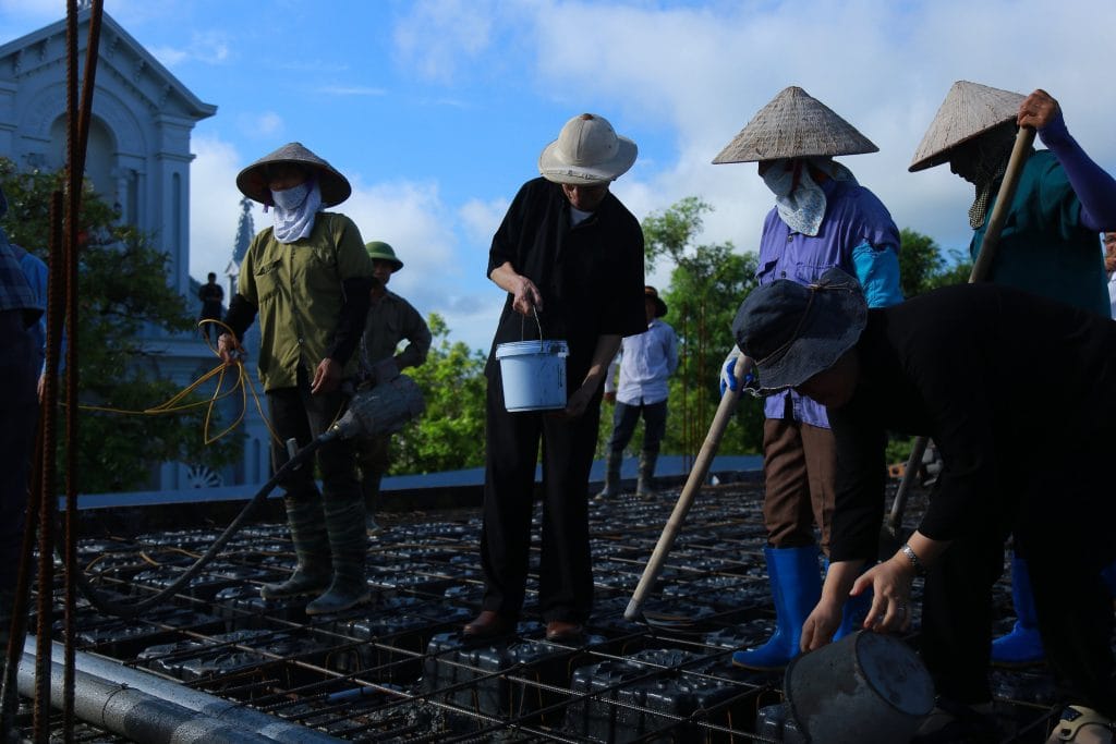Không khí vui mừng của ngày lễ Mẹ Lên Trời (15/08) dường như được nhân lên gấp bội đối với bà con Giáo xứ Đền Thánh Bác Trạch. Con đường làng trở nên nhỏ bé chật hẹp hơn bởi những bước chân nhộn nhịp trở về với khuôn viên của cộng đoàn Mến Thánh Giá Bác Trạch từ rất sớm, để theo dõi việc đổ mái cũng như chia sẻ niềm vui với Quý Dì. Các bác trong Ban trách nhiệm công trình cùng tổ thợ cũng hối hả cho các khâu chuẩn bị cho việc đổ mái…Ơn Chúa đã tuôn đổ trên cộng đoàn qua lời chuyển cầu của Đức Mẹ, thể hiện cách rõ nét khi thời tiết rất thuận hòa, tình người chứa chan trên từng nét mặt của quý Đấng Bậc và cộng đoàn.