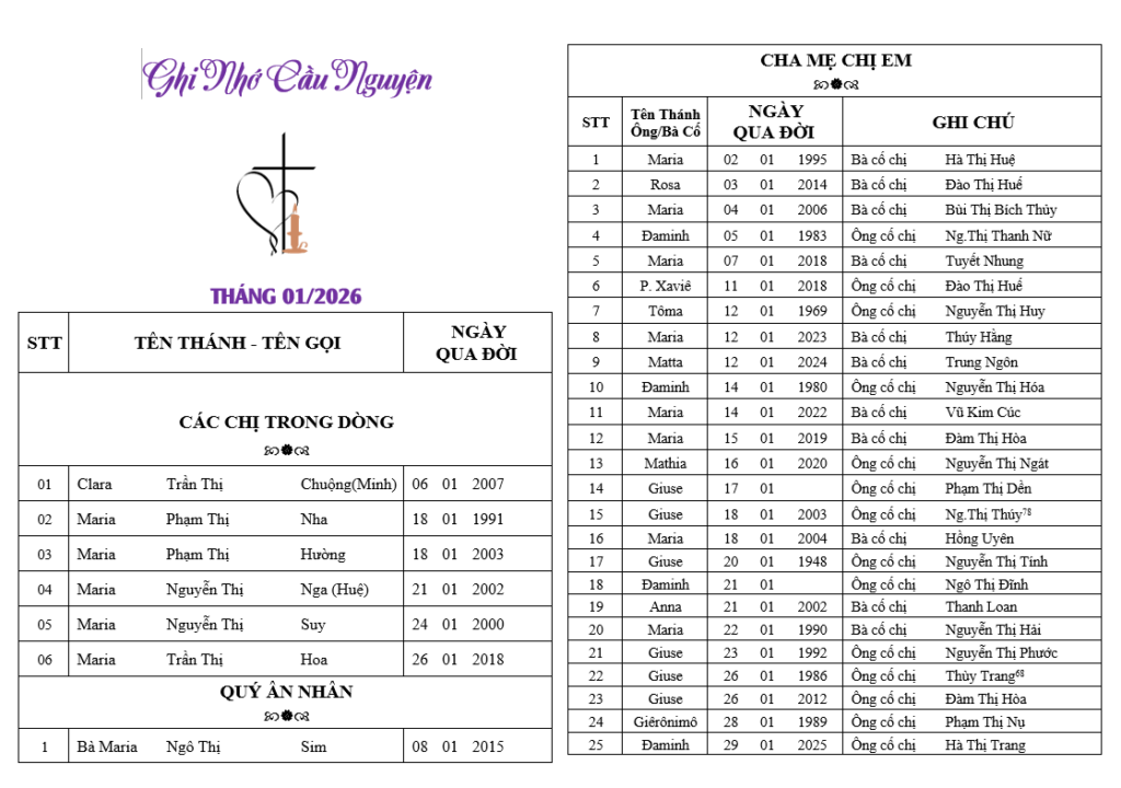 Ghi Nhớ Cầu Nguyện Tháng 01/2026
