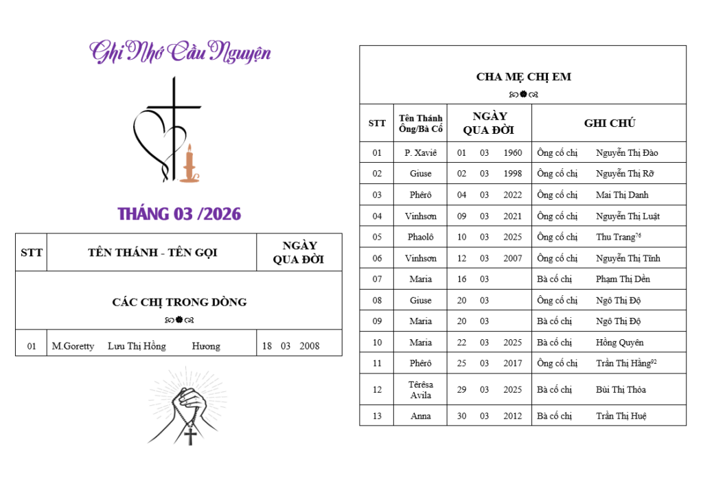 Ghi Nhớ Cầu Nguyện Tháng 03/2026
