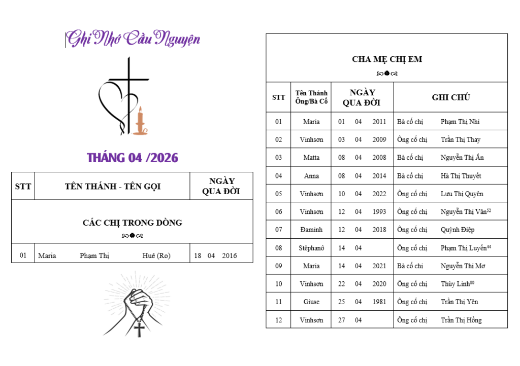Ghi Nhớ Cầu Nguyện Tháng 04/2026