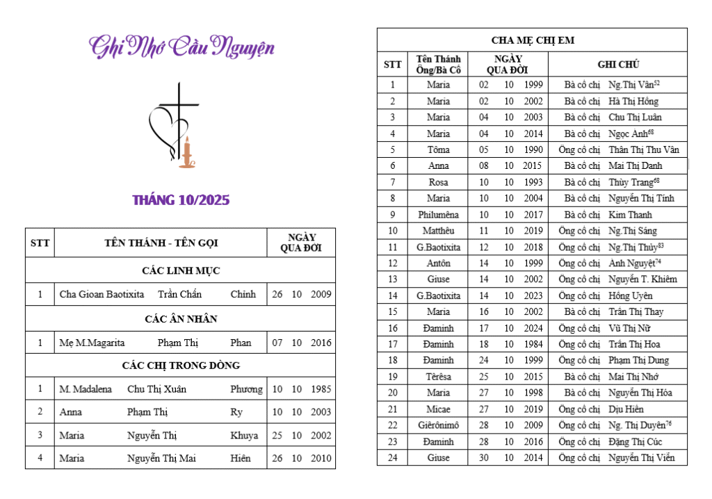 Ghi Nhớ Cầu Nguyện (Tháng 10.2025)