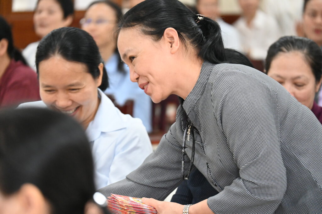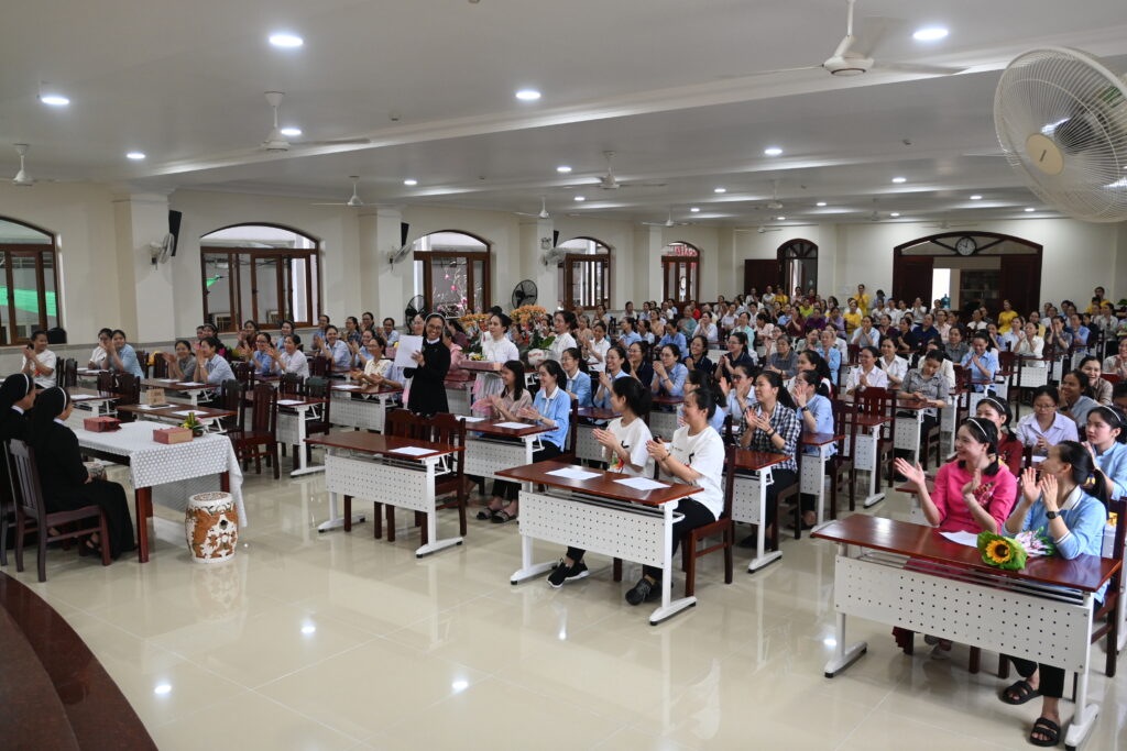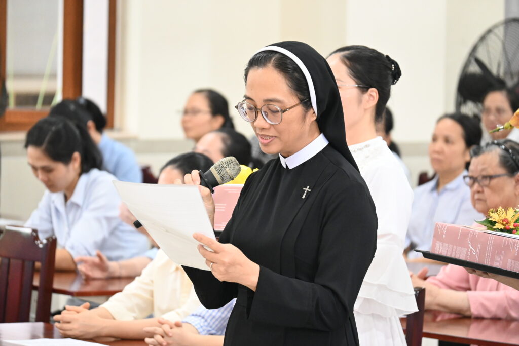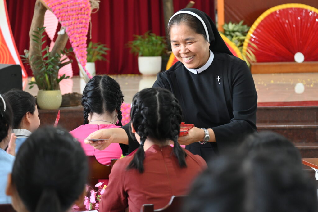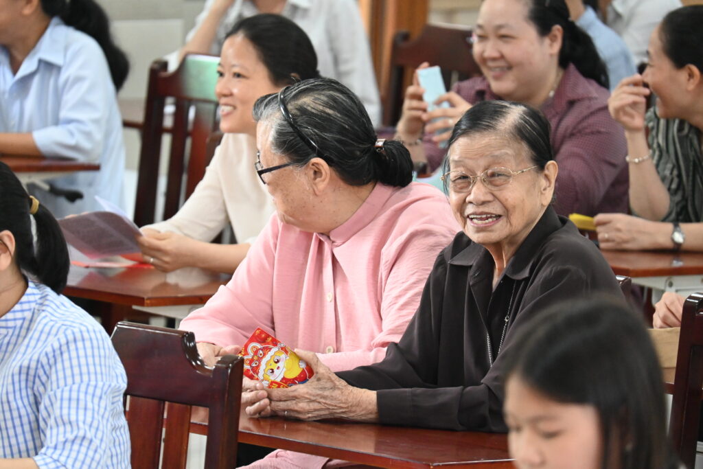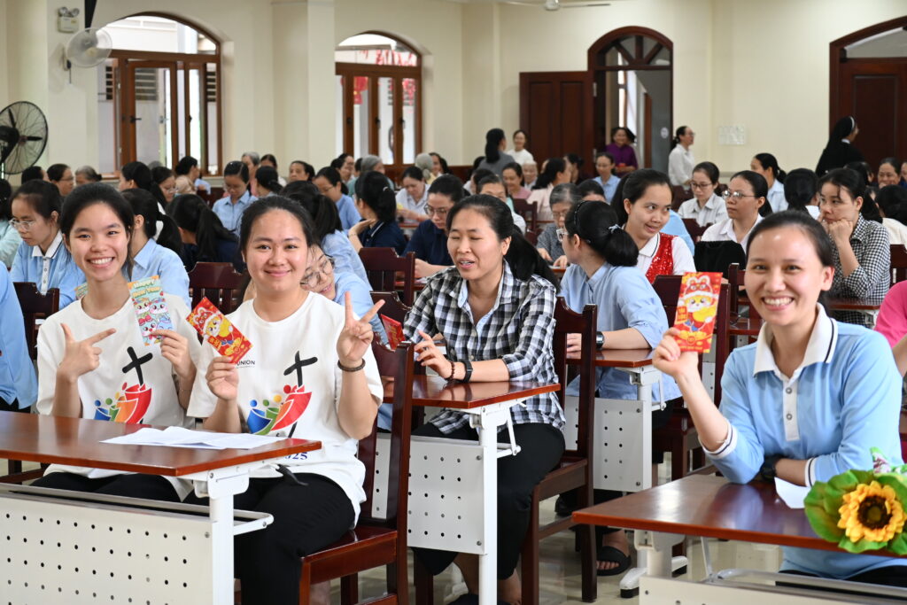 Sau những tiết mục văn nghệ rộn ràng và đầy ý nghĩa, chị Tổng Thư ký đã đại diện toàn thể chị em dâng lên quý Bề trên tâm tình tri ân chân thành cùng những lời kính chúc năm mới chan chứa ân sủng và bình an. Tiếp đó, những tâm tình sâu lắng và lời cầu chúc đầu xuân từ chị Tổng Phụ trách và chị Phó Tổng Phụ trách được gửi trao đến toàn thể chị em trong bầu khí gia đình thật ấm áp và hiệp nhất. Những phong bao lì xì đỏ thắm được trao tận tay từng chị em không chỉ mang theo lời chúc bình an và may mắn đầu năm, mà còn trở thành dấu chỉ sống động của tình gia đình Hội Dòng, nơi mỗi người được đón nhận, được yêu thương và cùng nhau bước đi trong niềm vui chung.