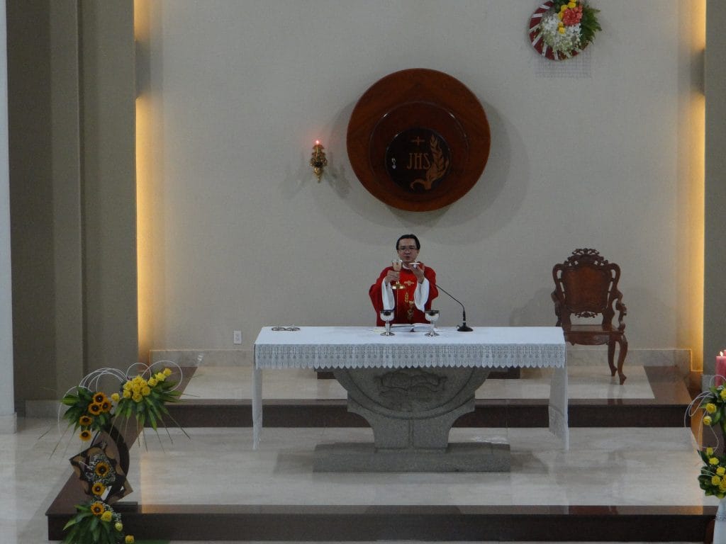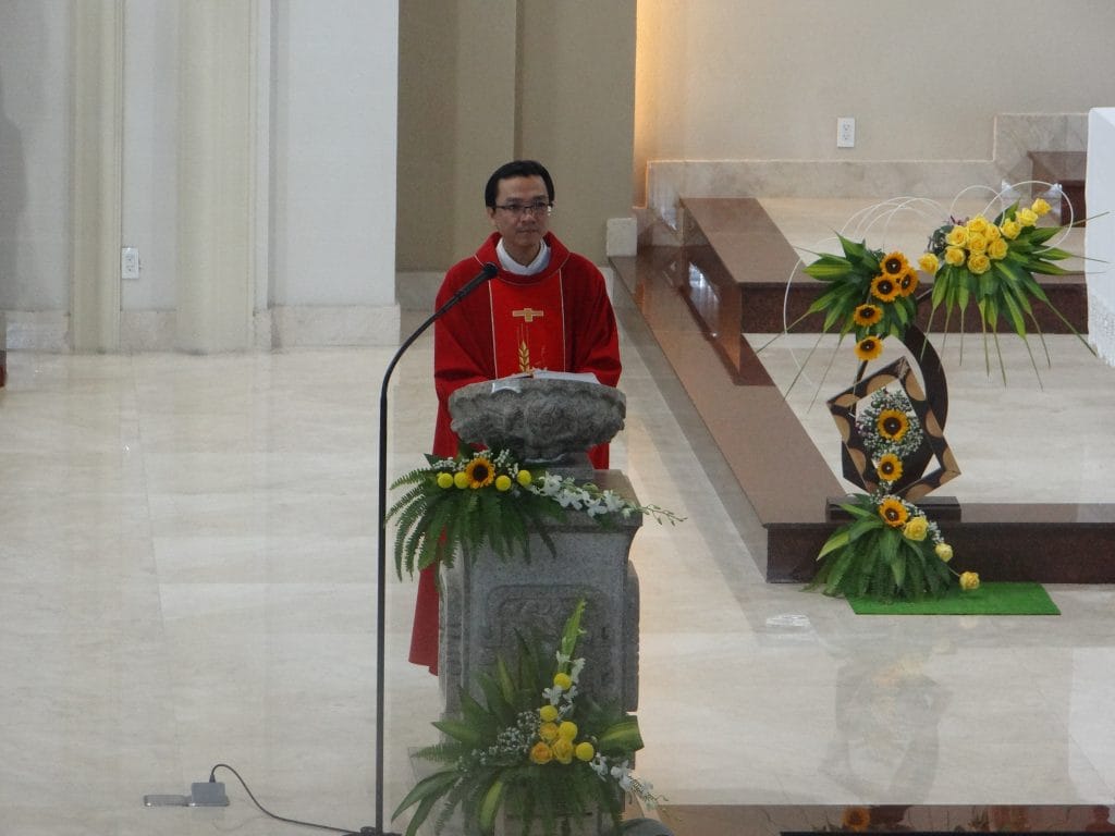 Trong Thánh lễ trọng thể hôm nay, Cha chủ tế Giuse Nguyễn Hữu Phước – Cha phó Giáo xứ Tân Đức đã chia sẻ rất sâu sắc. Cha đã đặt câu hỏi: “Tại sao Dòng Mến Thánh Giá lại lấy tước hiệu là Suy tôn Thánh giá mà không phải là tước hiệu khác?” bởi mỗi người nữ tu MTG đã cảm nghiệm được giá trị và sức mạnh của Thánh giá trong hành trình đức tin, hành trình bước theo Chúa. Cha mời gọi mỗi người không phải chỉ nhìn lên thánh giá nhưng hãy chiêm ngắm hình ảnh Đấng chịu đóng đinh trên cây Thánh giá ấy để chúng ta được chữa lành và tìm được sự giải đáp cho những đau khổ trong cuộc sống. Chúa Giêsu đã trải qua đau khổ để chung chia phận làm người với chúng ta và Ngài đã phục sinh mang lại niềm hy vọng cho chúng ta “Qua đau khổ sẽ tới sự sống mới trong Đức Kitô”.