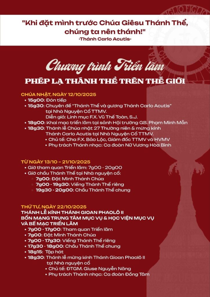 WTGPSG (26/9/2025) – Triển lãm của Thánh Carlo Acutis về “Phép Lạ Thánh Thể Trên Thế Giới” sẽ được trình bày và trưng bày tại Trung tâm Mục vụ (TTMV) Tổng Giáo phận Sài Gòn (TGPSG) từ ngày 12/10 đến 22/10/2025. Sự kiện này hướng đến lễ kính Thánh Gioan Phaolô II – Bổn mạng của TTMV và Học viện Mục vụ (HVMV) TGPSG – vào ngày 22/10/2025.